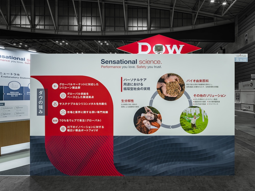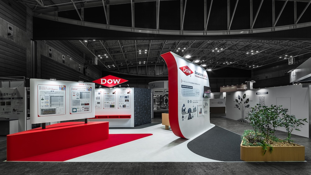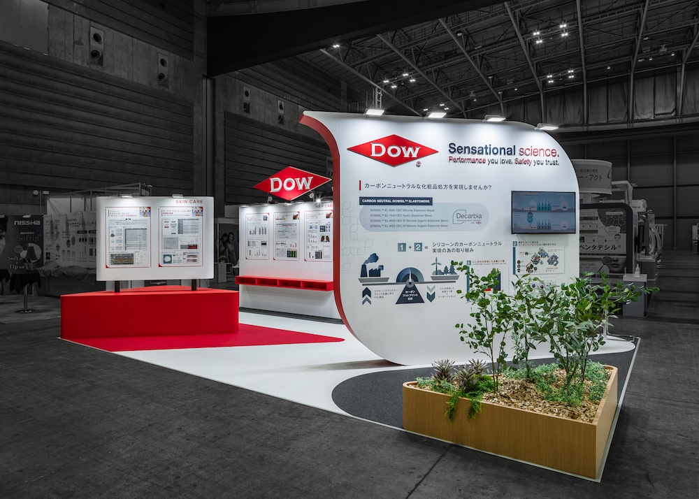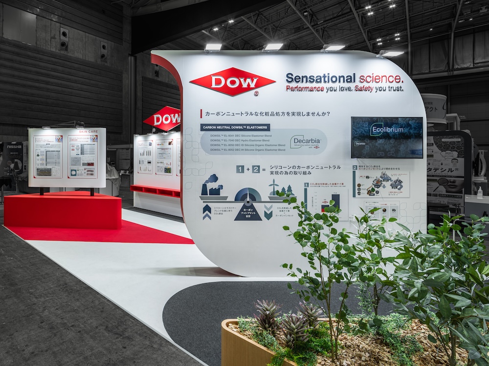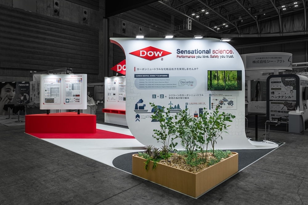 CITE-JAPAN2025(化粧品産業技術展)に出展した化学素材メーカーDOW(ダウ)の展示会ブースデザイン。化粧品処方領域におけるカーボンニュートラルなシリコーンソリューションを通じ、グローバルブランドならではの総合提案力を訴求した事例である。