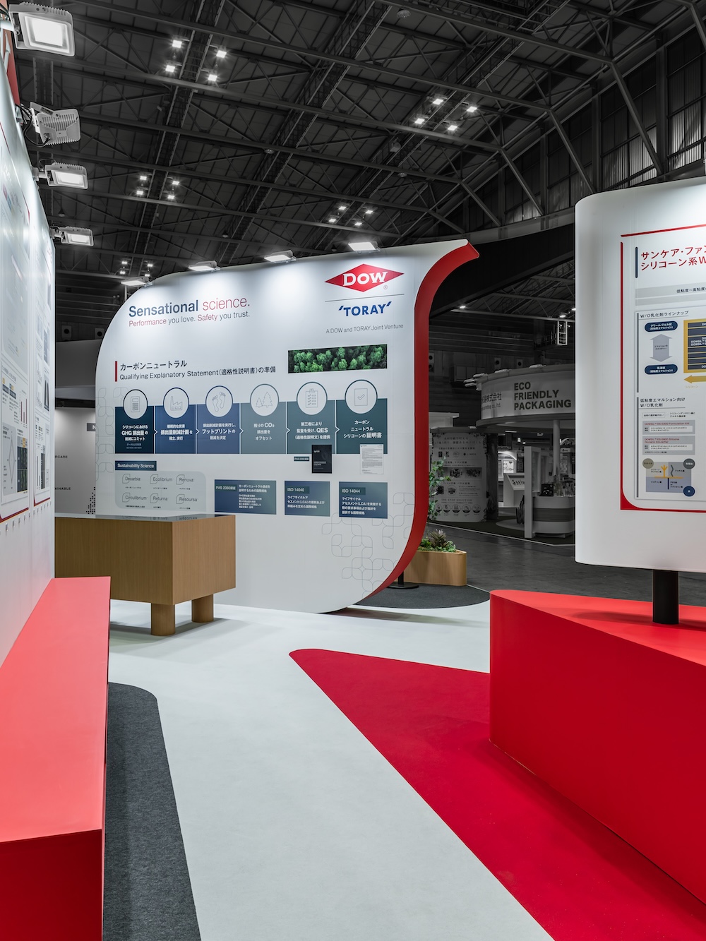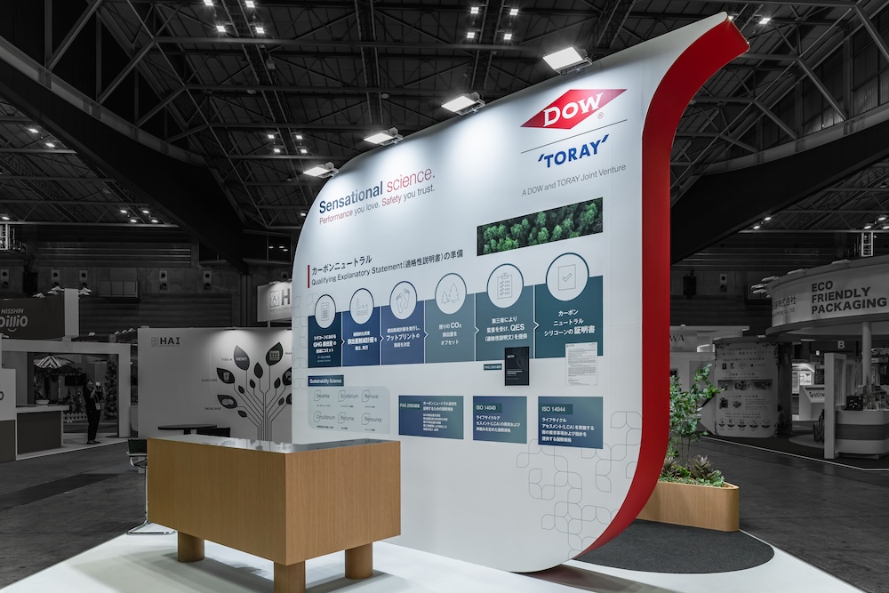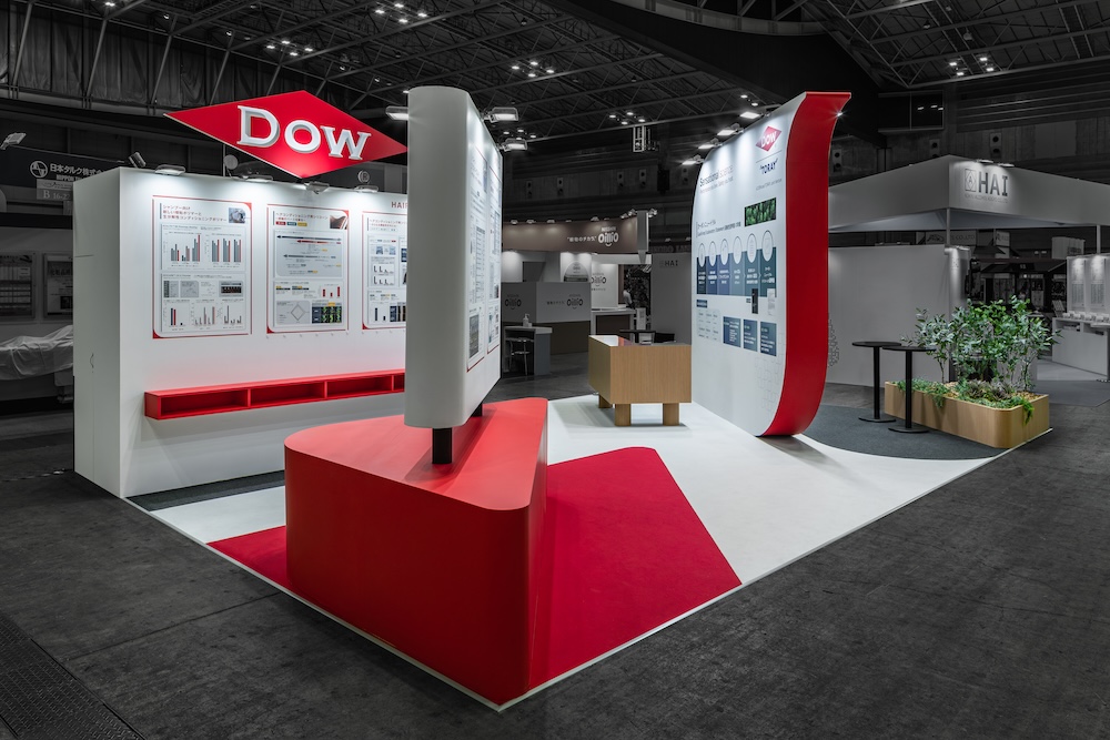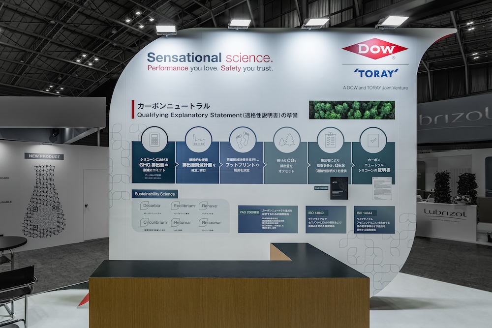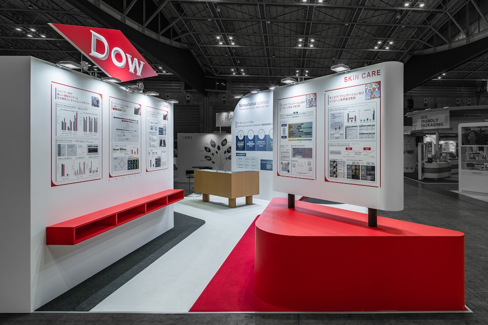 The exhibition booth design for chemical materials manufacturer DOW at CITE-JAPAN2025 (Cosmetic Industry Technology Exhibition). This case showcases the company’s comprehensive proposal capabilities as a global brand, highlighting carbon-neutral silicone solutions for cosmetic formulations.