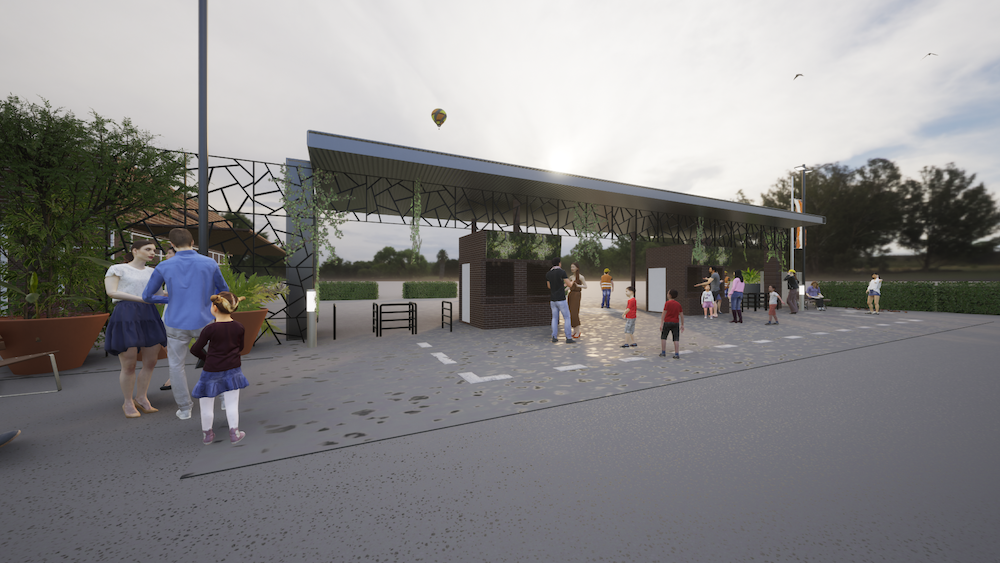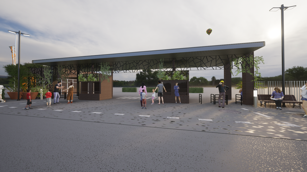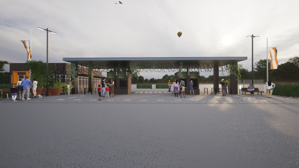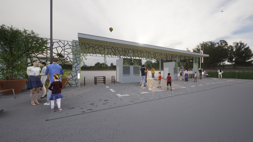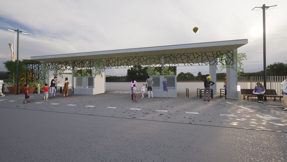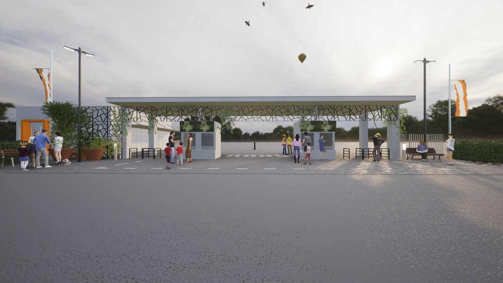 Concept design for the entrance gate and entrance space of an experiential theme park centred on the theme of ‘food education × leisure’, planned for a suburban location. To address the ageing of existing facilities and improve the visitor experience, a large roof covering the entire gate was constructed, creating an entrance space that can be comfortably used even in rainy weather. To accommodate visitor demographics, distinct circulation routes were established for individual and group visitors. A pass-through entry function for minibuses was introduced to facilitate group access.